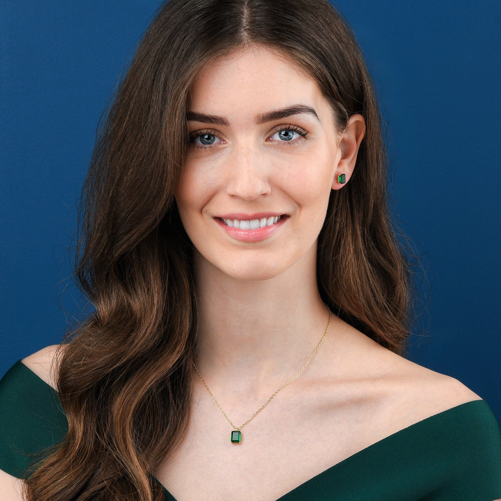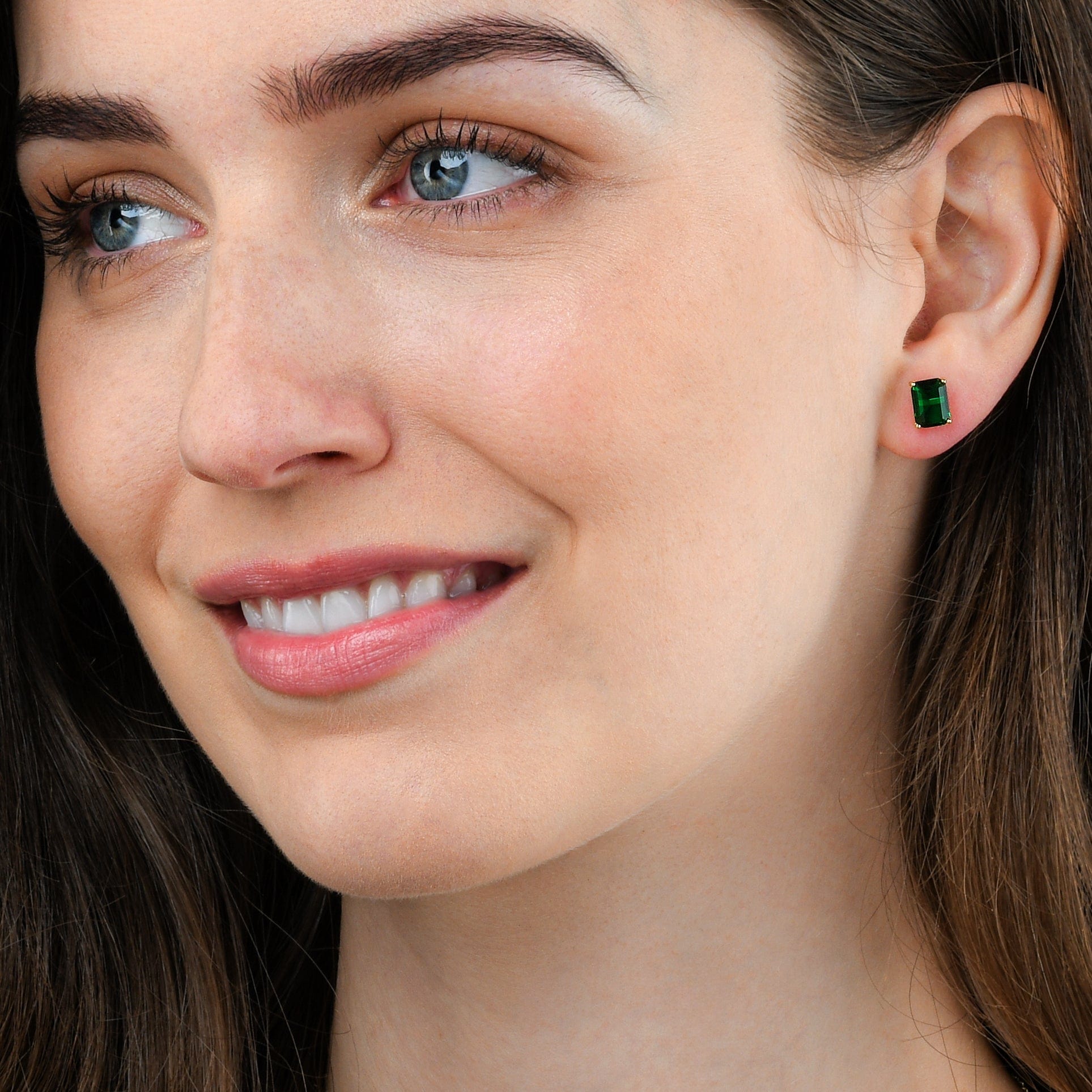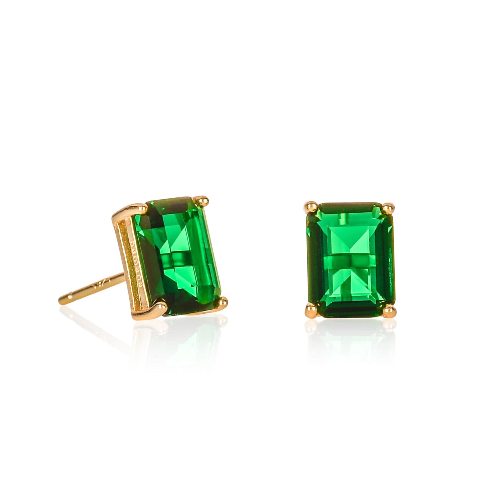 • Dainty gold earrings for women with 6mm by 8 mm Emerald-cut green stones.