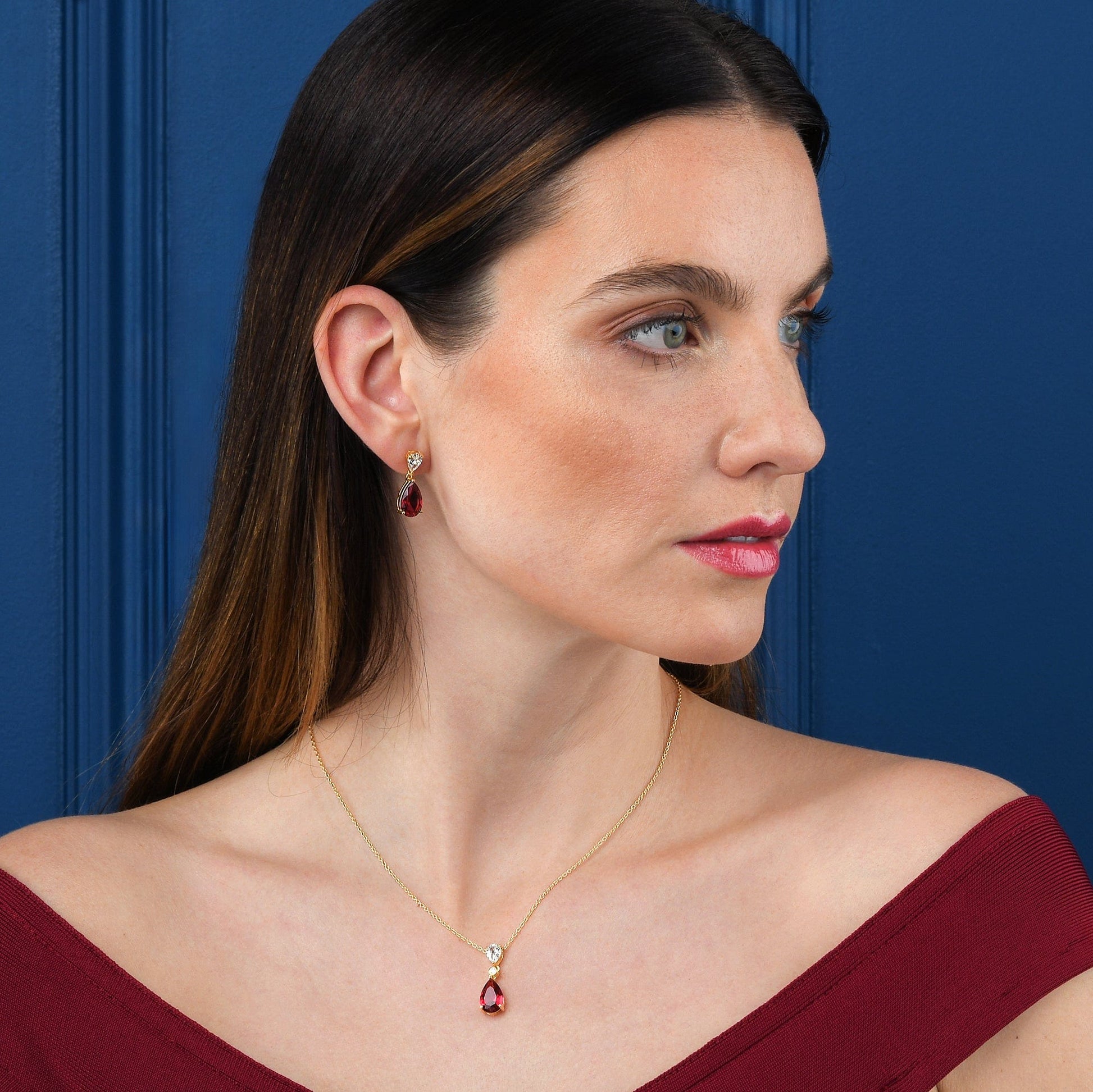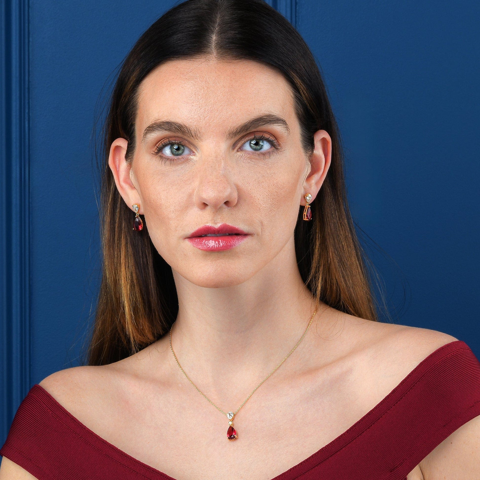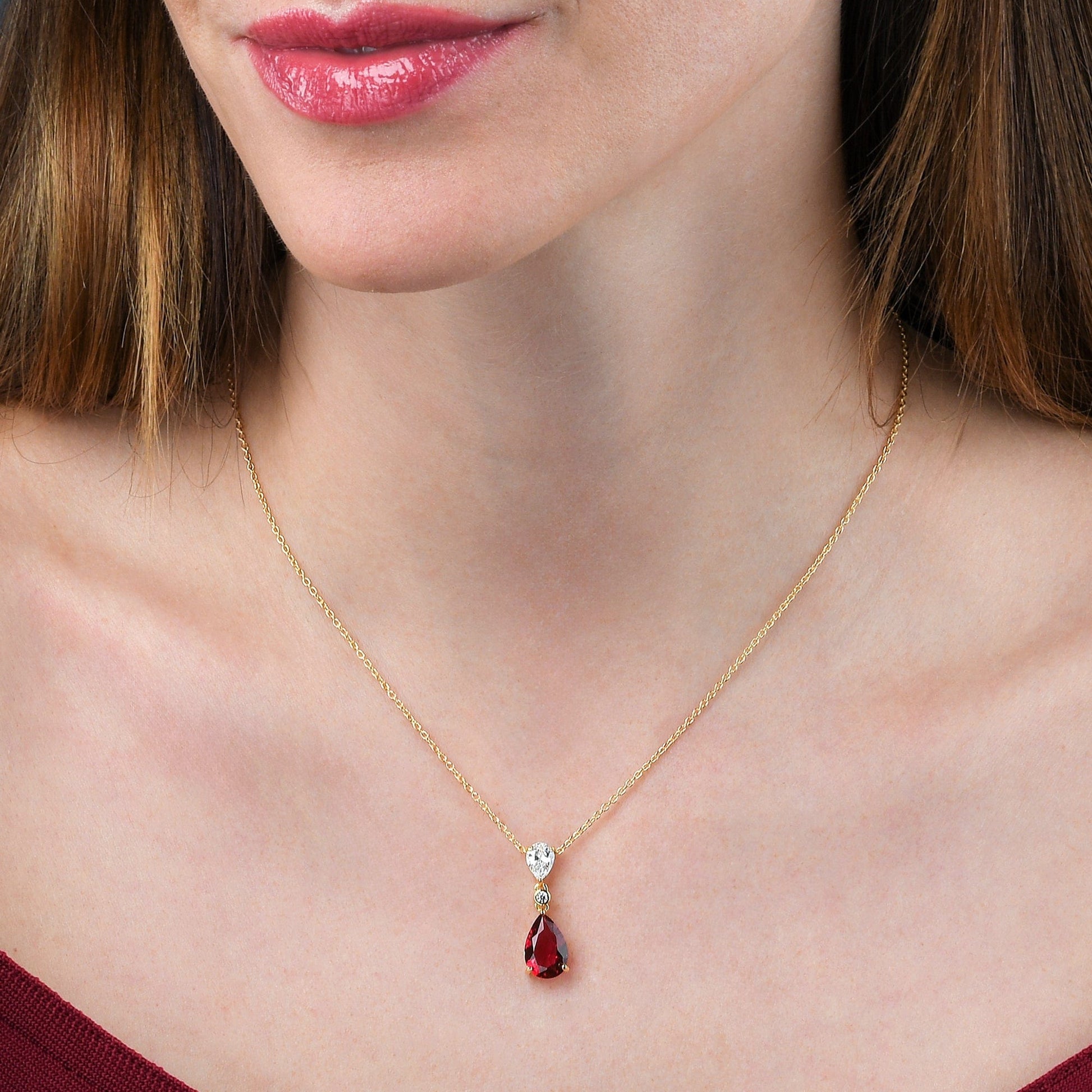 • 25mm long drop pendant set with a 8mm x 12mm pear shaped ruby red cubic zirconia stone and a 5mm x 7mm pear shaped white cubic zirconia stone, pendant on an adjustable
