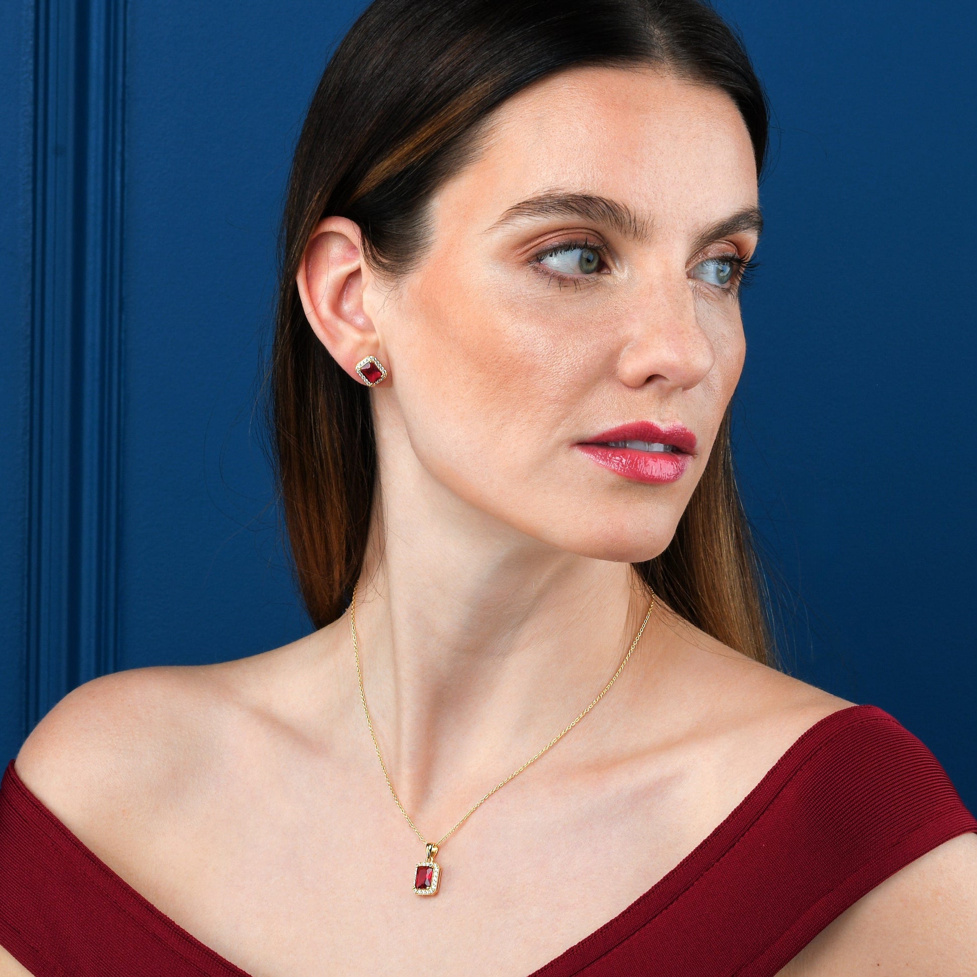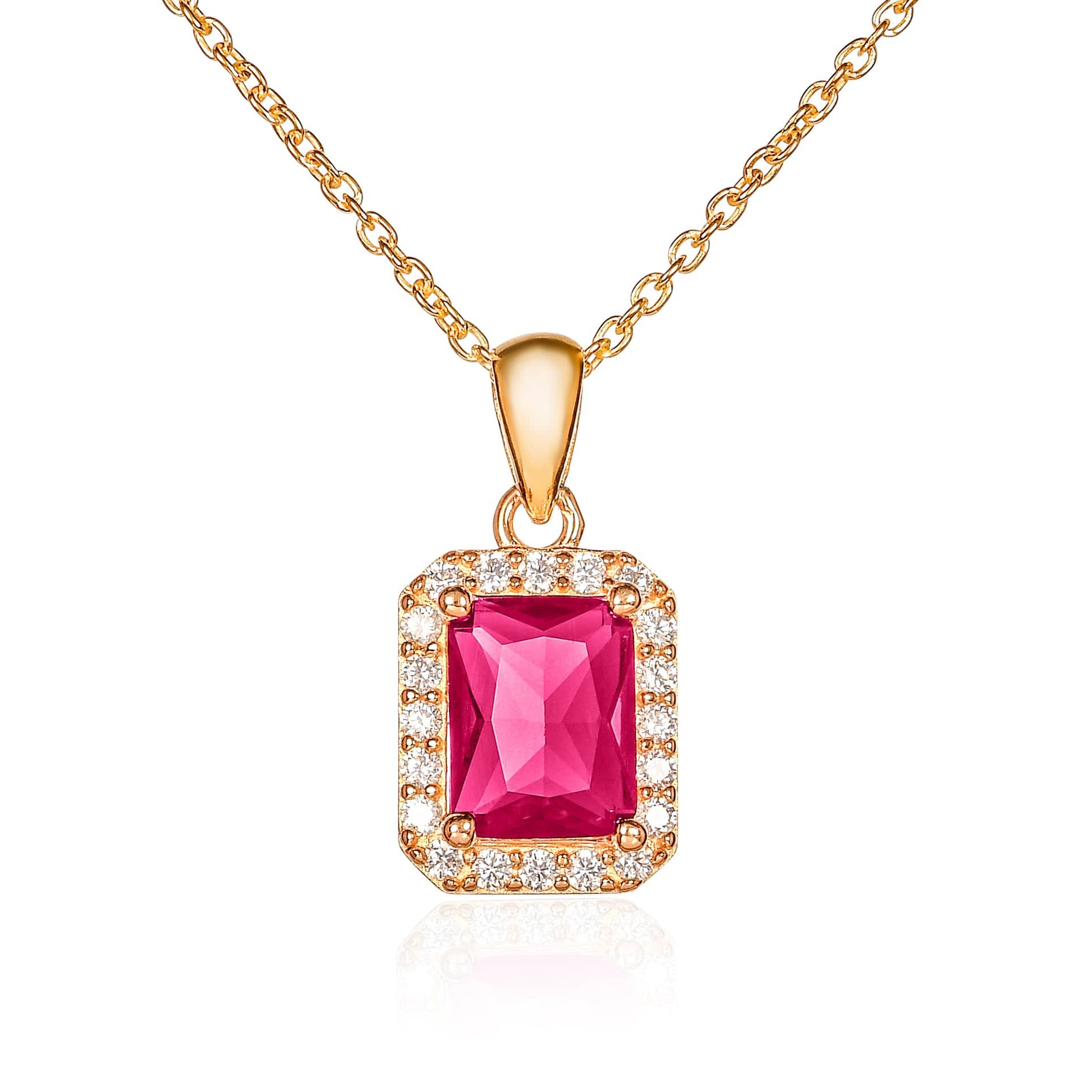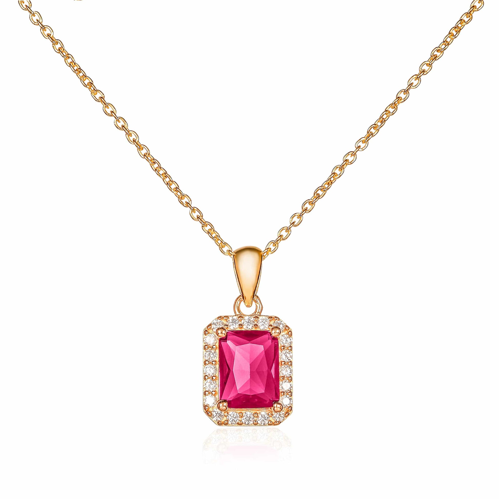 Gold Plated 925 Sterling Silver Red Rectangle Halo Pendant Necklace For Women
