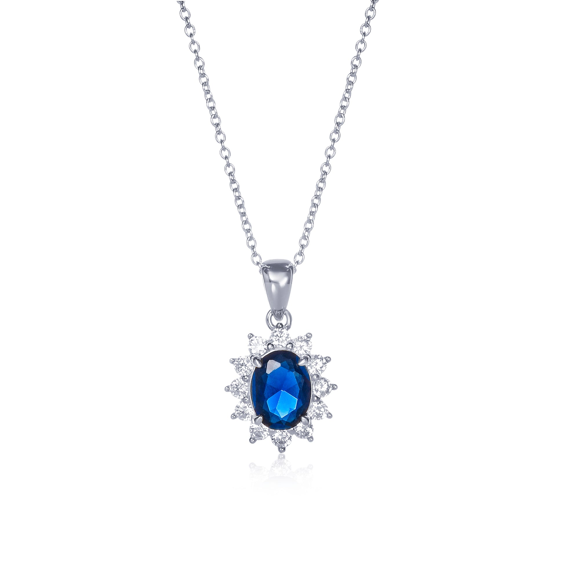 • 925 Sterling Silver necklace for women with a silver pendant set with an oval blue AAA cubic zirconia stone with a halo of smaller white cubic zirconia stones.