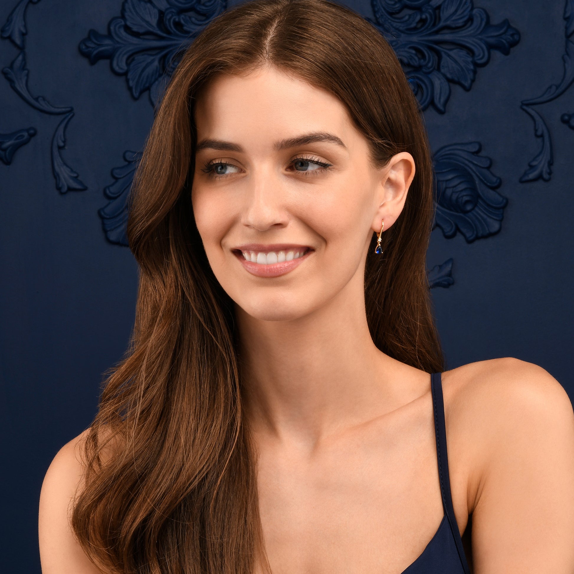 • Small gold drop earrings for women with 6 mm x 8 mm pear-shaped sapphire blue stones and an accent with 2 mm round clear cubic zirconia. Gold dangle earrings for women with leverback clasps.