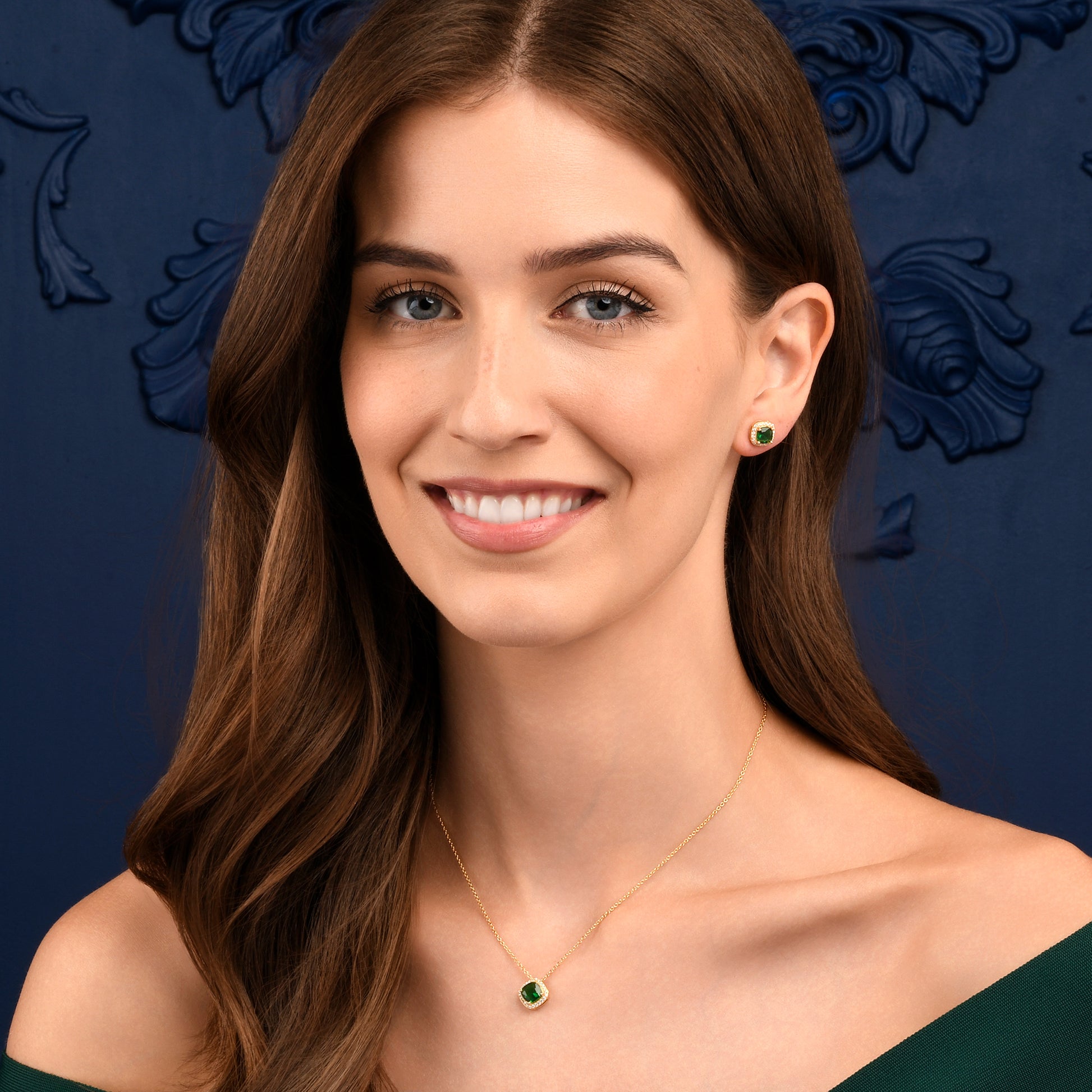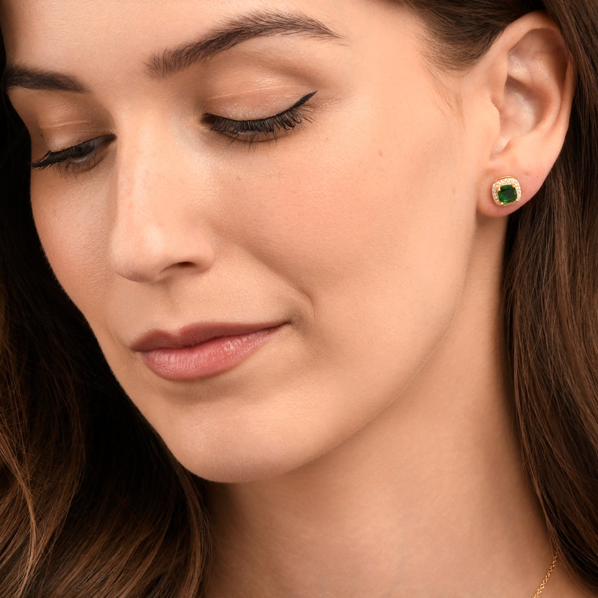 • 9 mm x 9 mm cushion-shaped stud earrings for women set with 6 mm x 6 mm cushion-cut emerald green cubic zirconia stones and a halo of small sparkling white cubic zirconia stones.