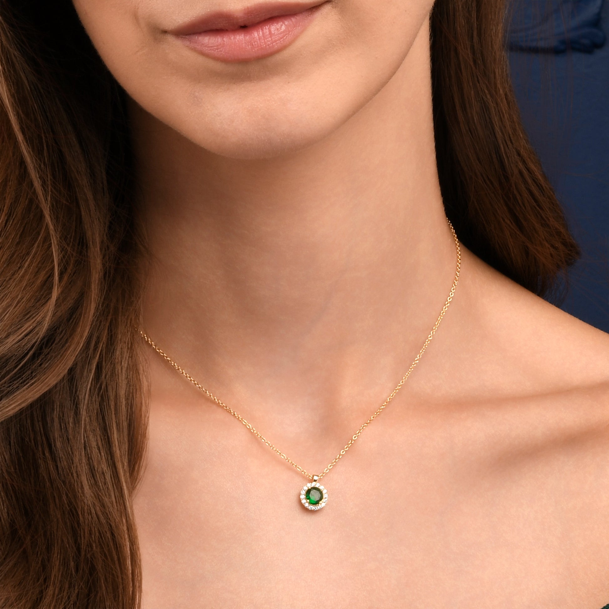 • Gold necklace for women with a classic halo pendant set with a round green AAA cubic zirconia stone with a halo of smaller white cubic zirconia stones.
