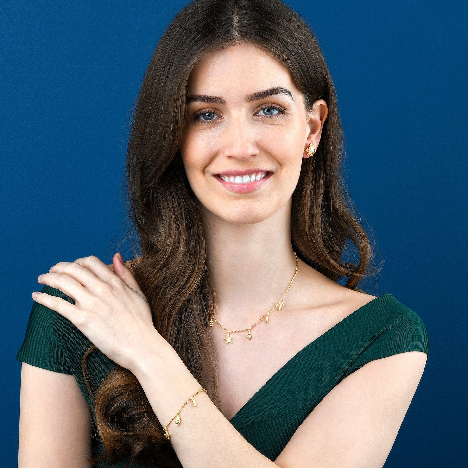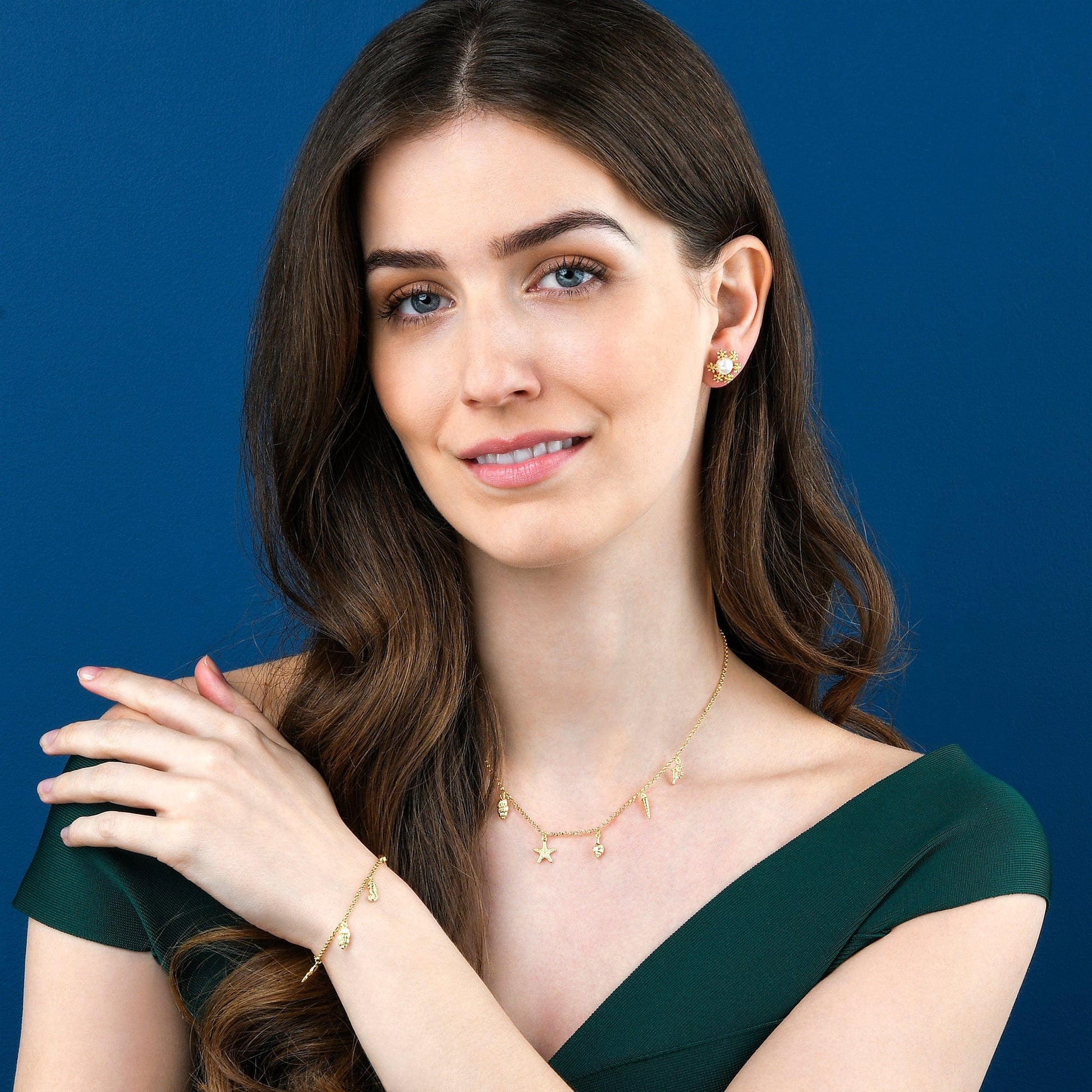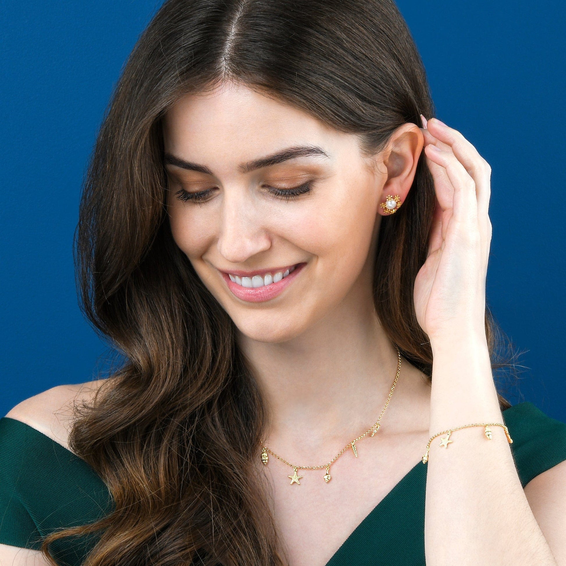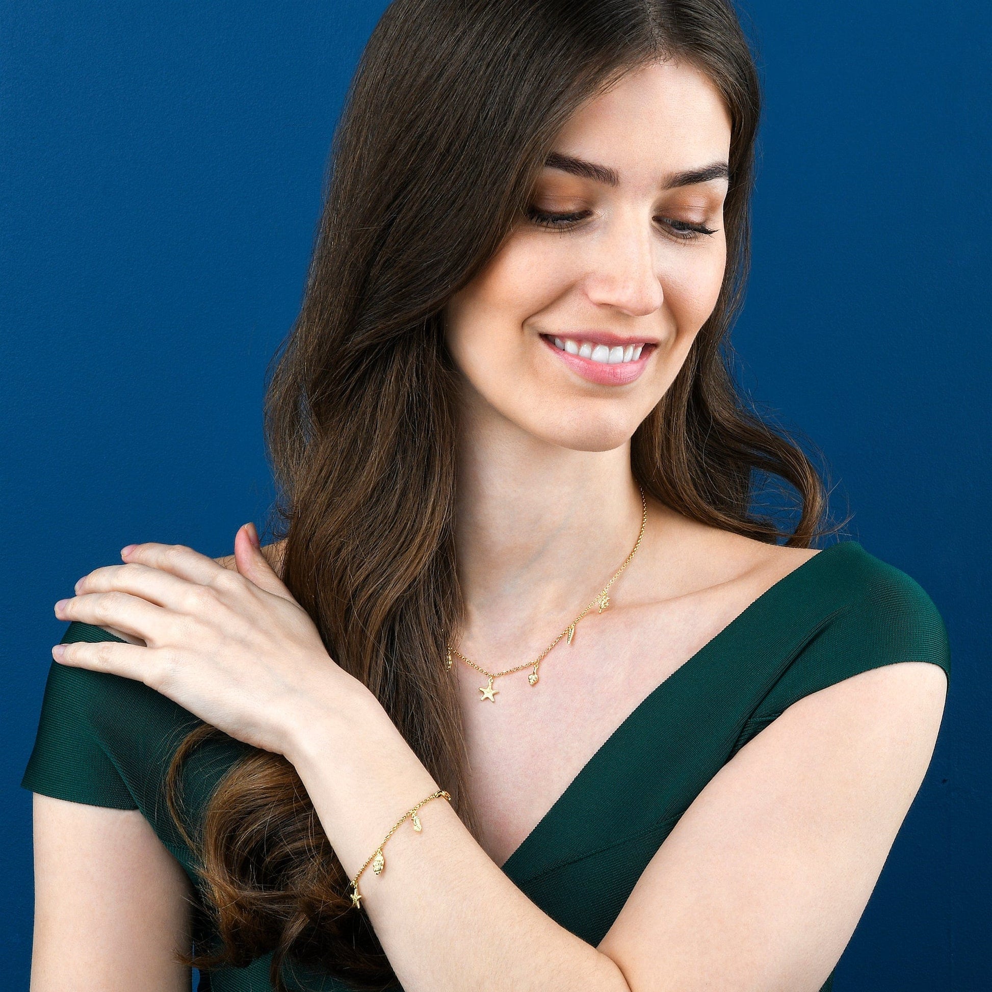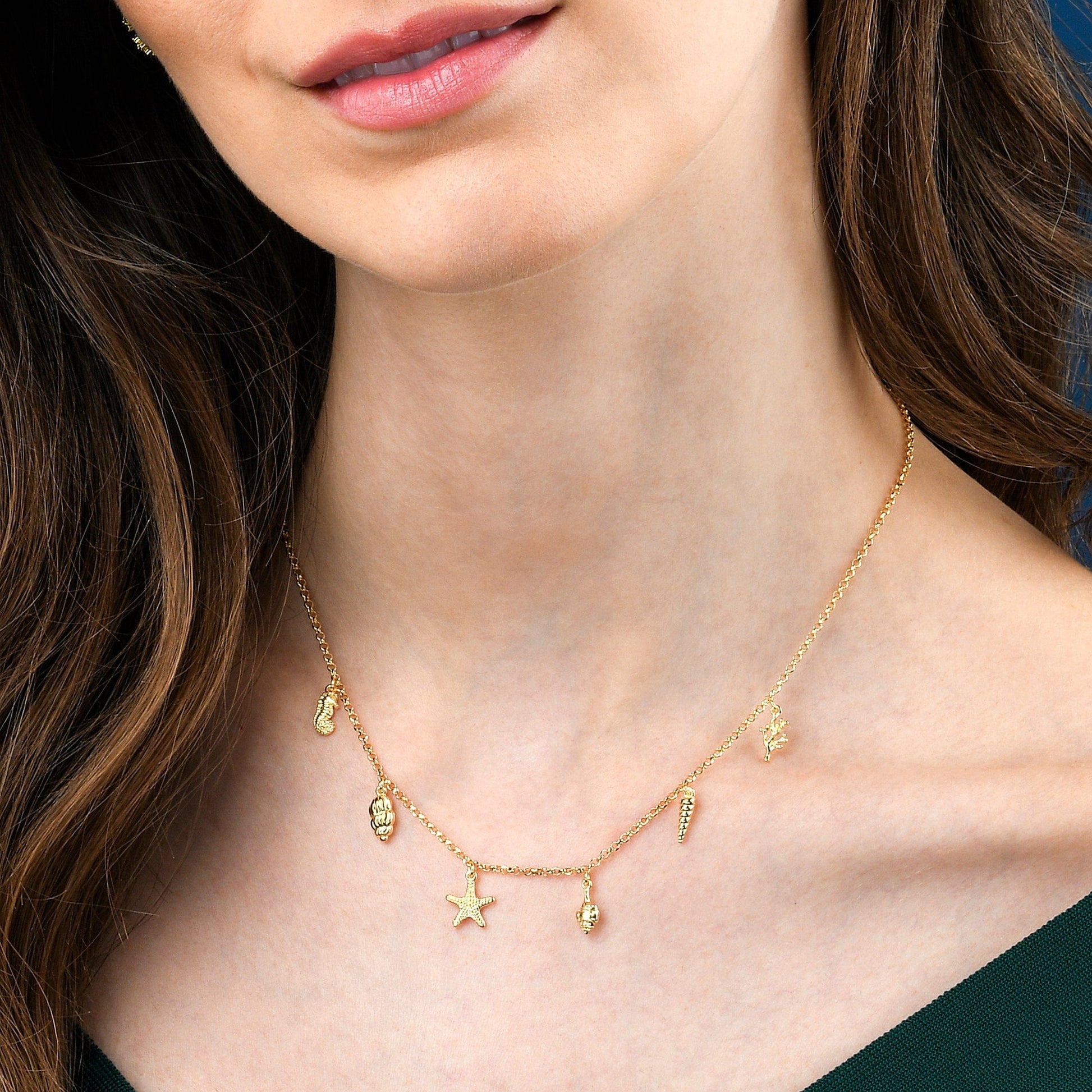 • Gold plated necklace for women with starfish, shells, seahorse, and coral charms.