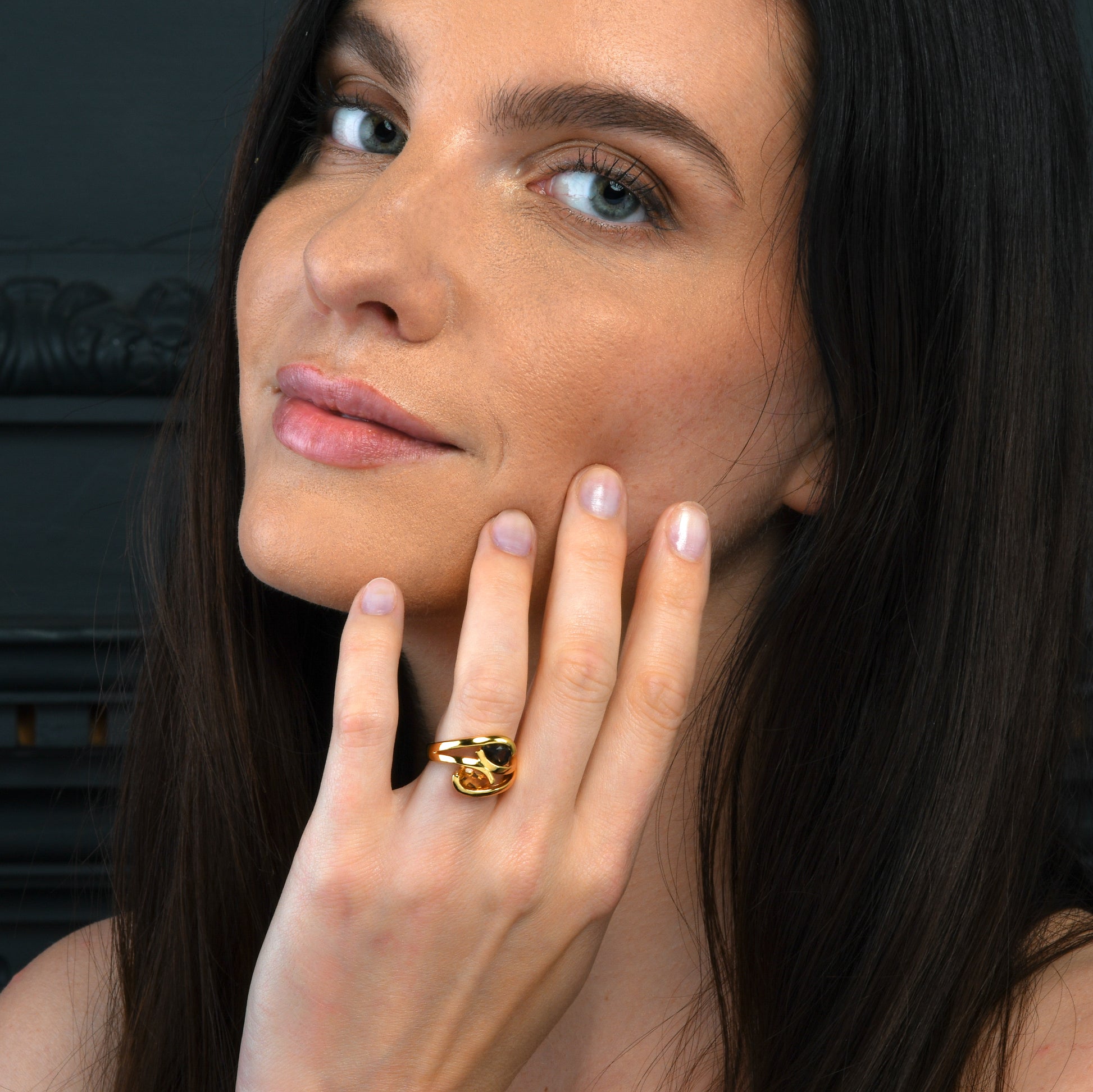• Elegant gold vermeil ring for women with two pear-shaped semi-precious gemstones. These stylish gold rings are set with a Citrine and a Smoky Quartz gemstone.