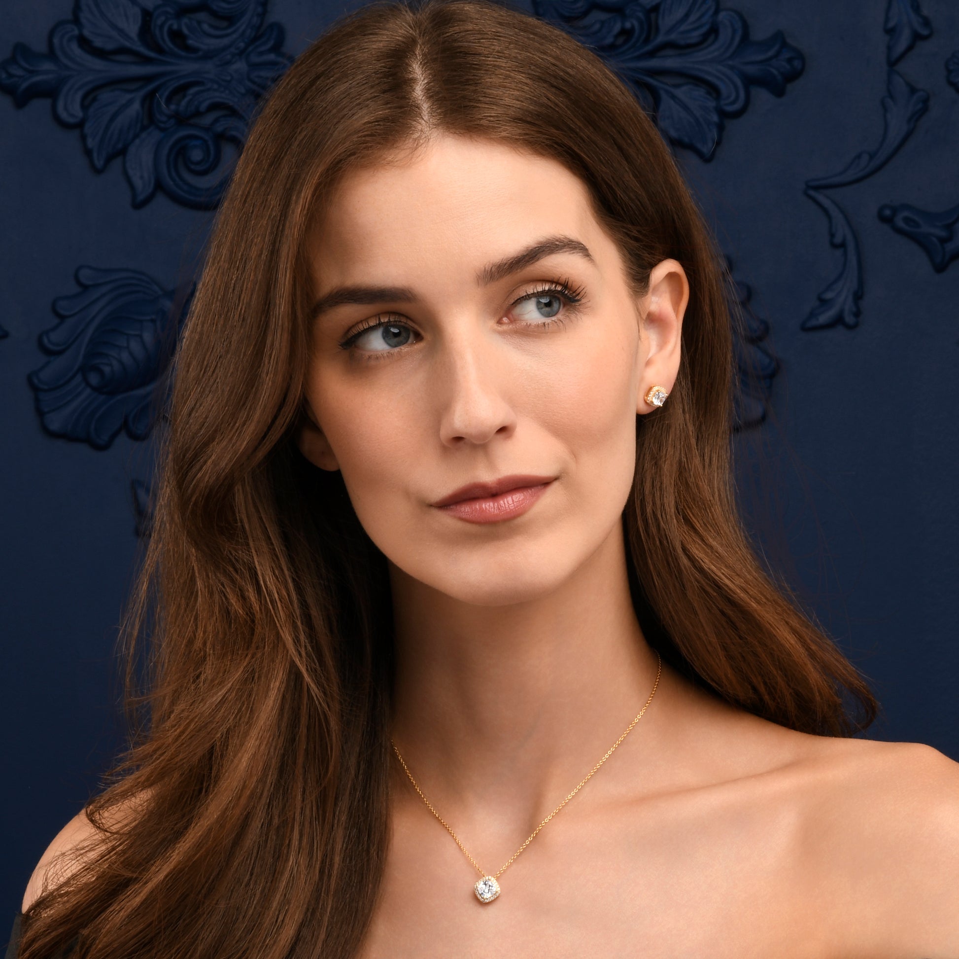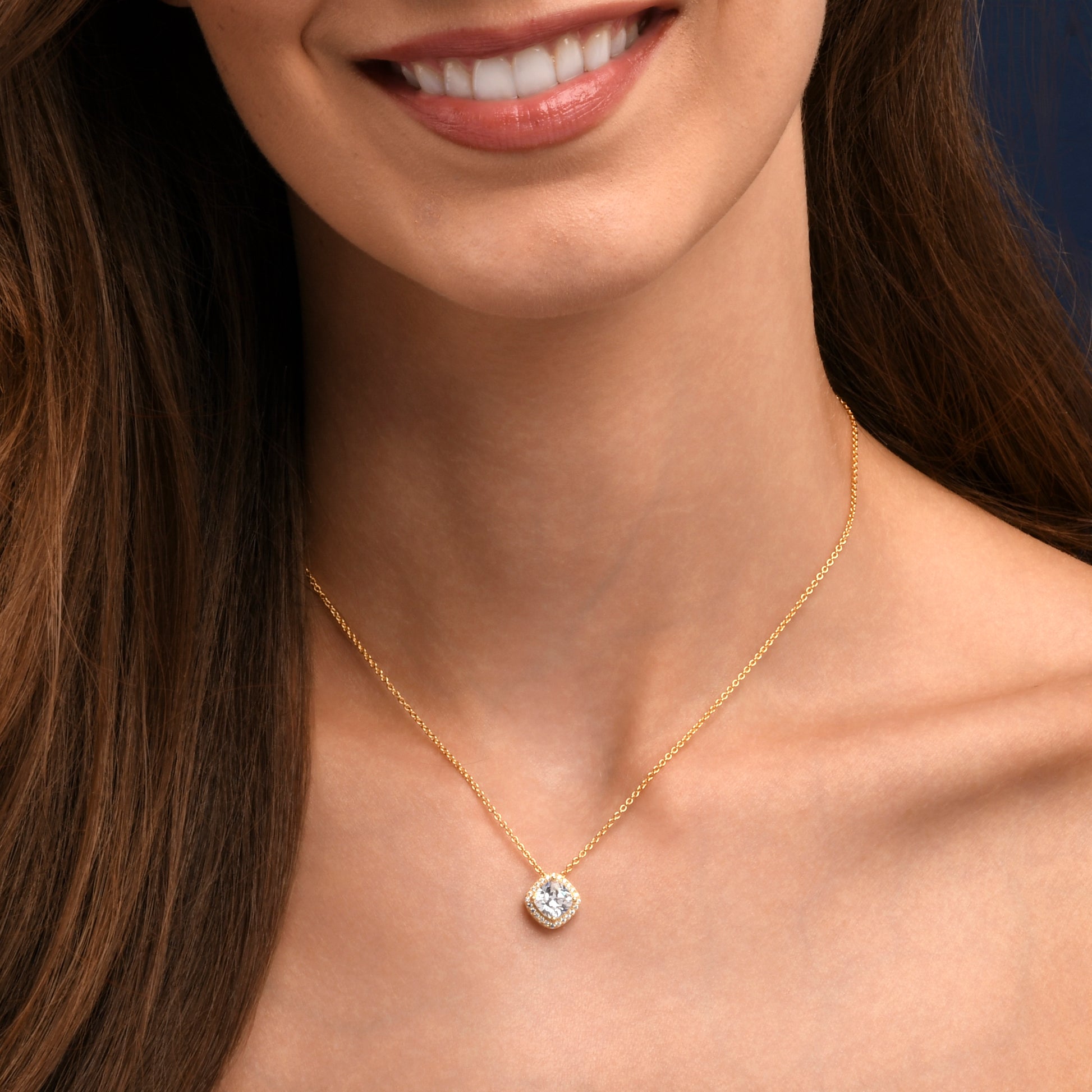• Gold necklace for women with a classic halo pendant set with a sparkling cushion-cut AAA cubic zirconia stone with a halo of smaller white cubic zirconia stones.
