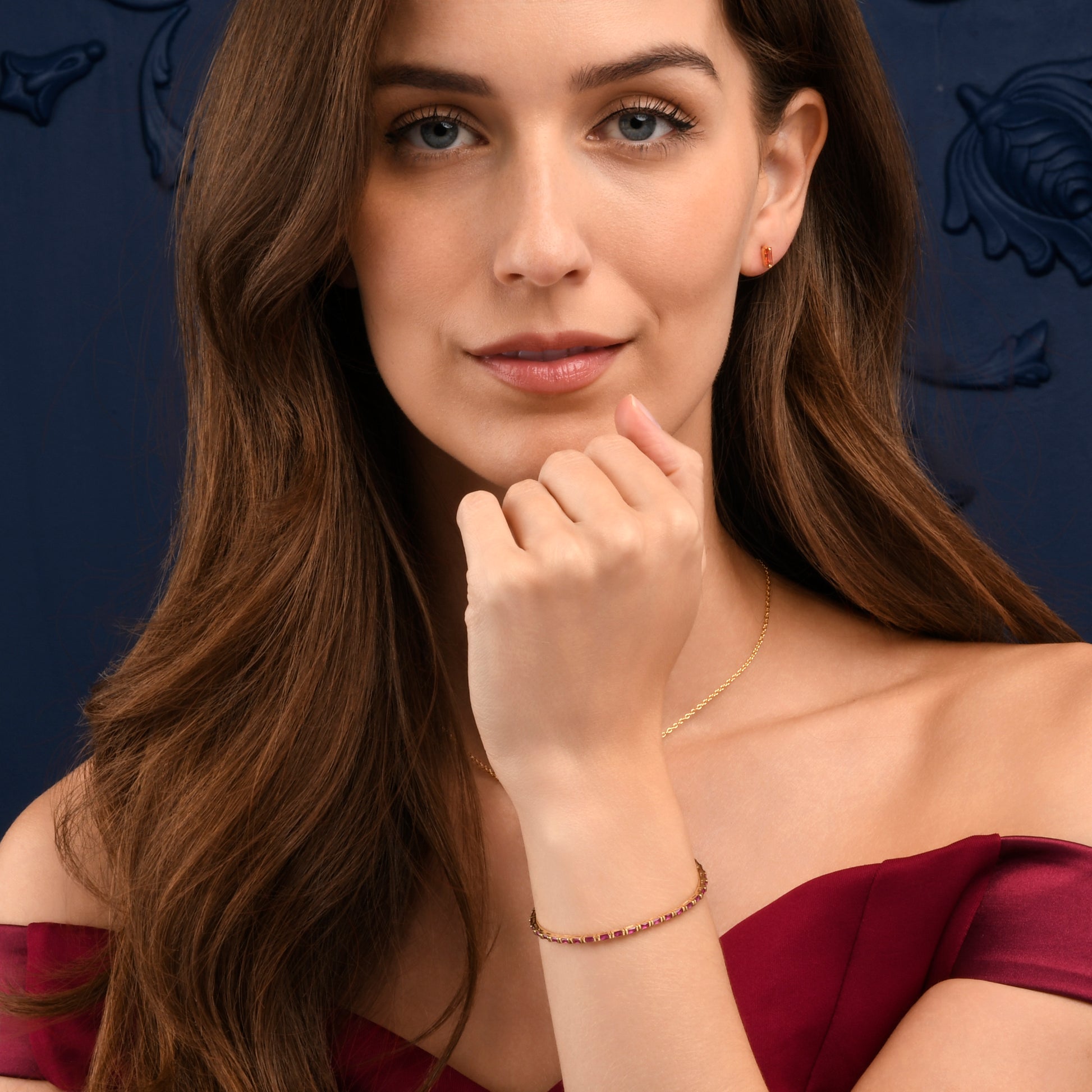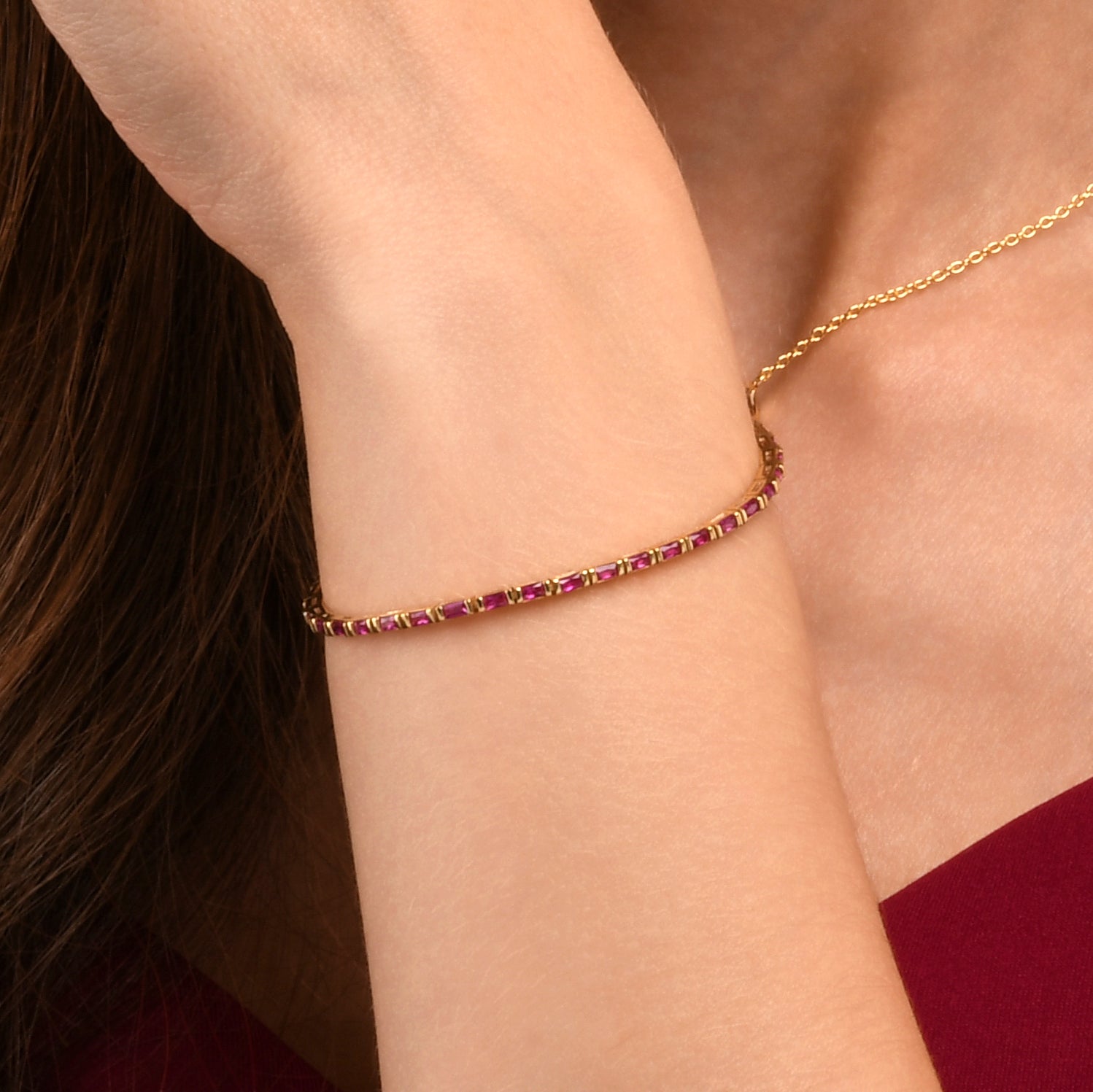 - Dainty gold bracelet for women set with baguette-cut red cubic zirconia stones.