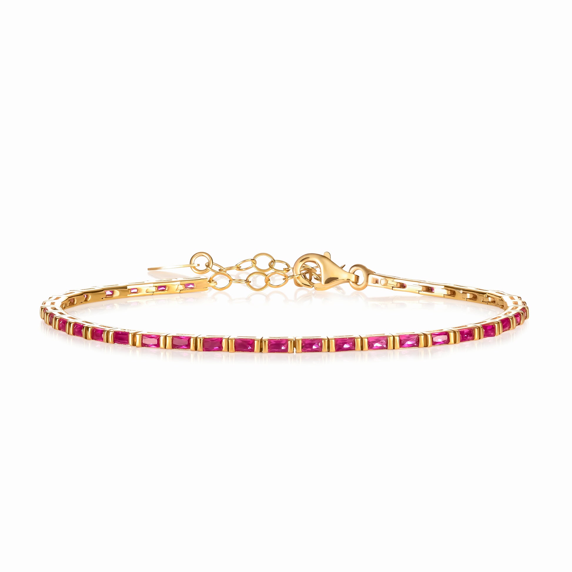 - 2mm wide sterling silver bracelet for women with 2 mm x 3 mm baguette cut red stones. 16 cm long bracelet with 5 cm extension links.