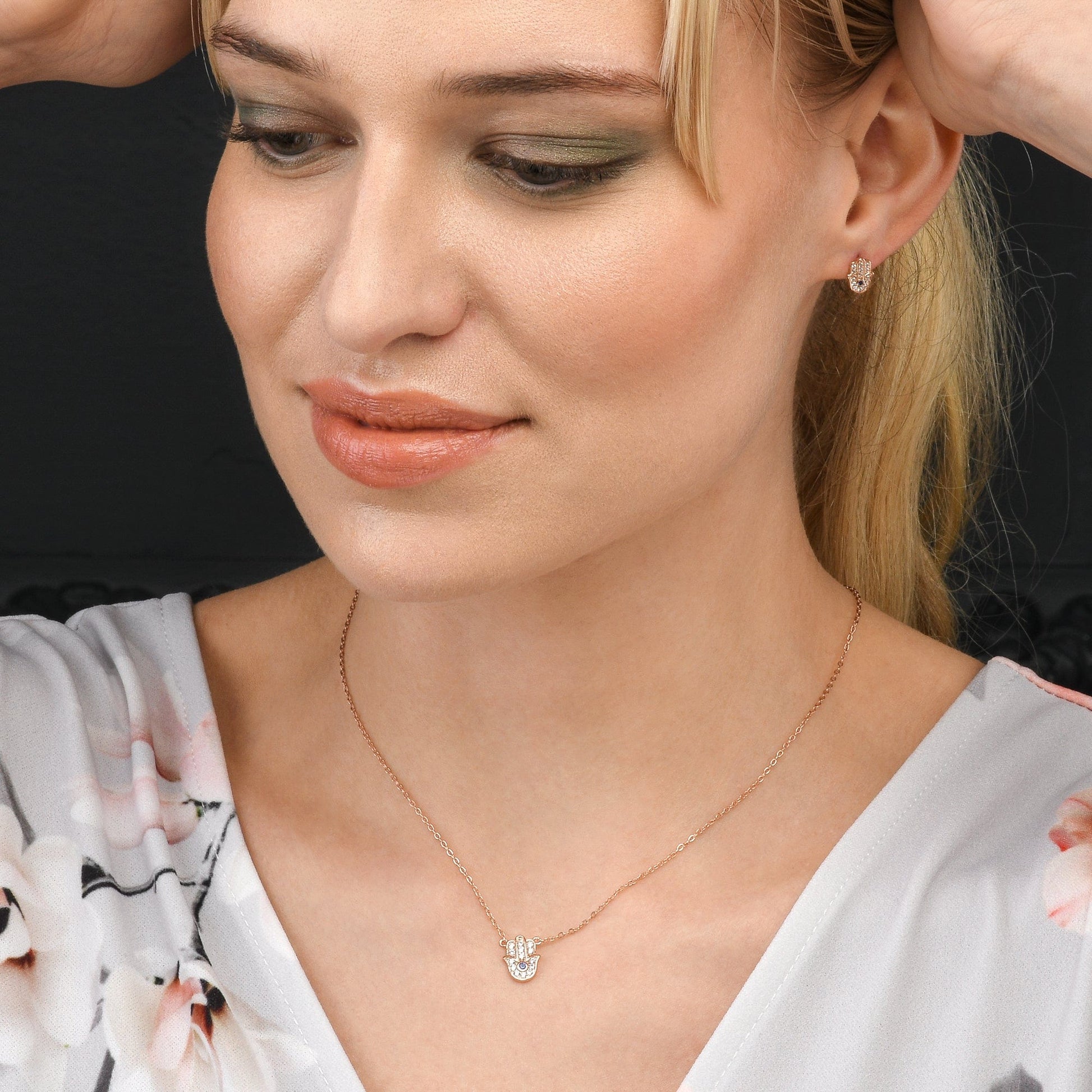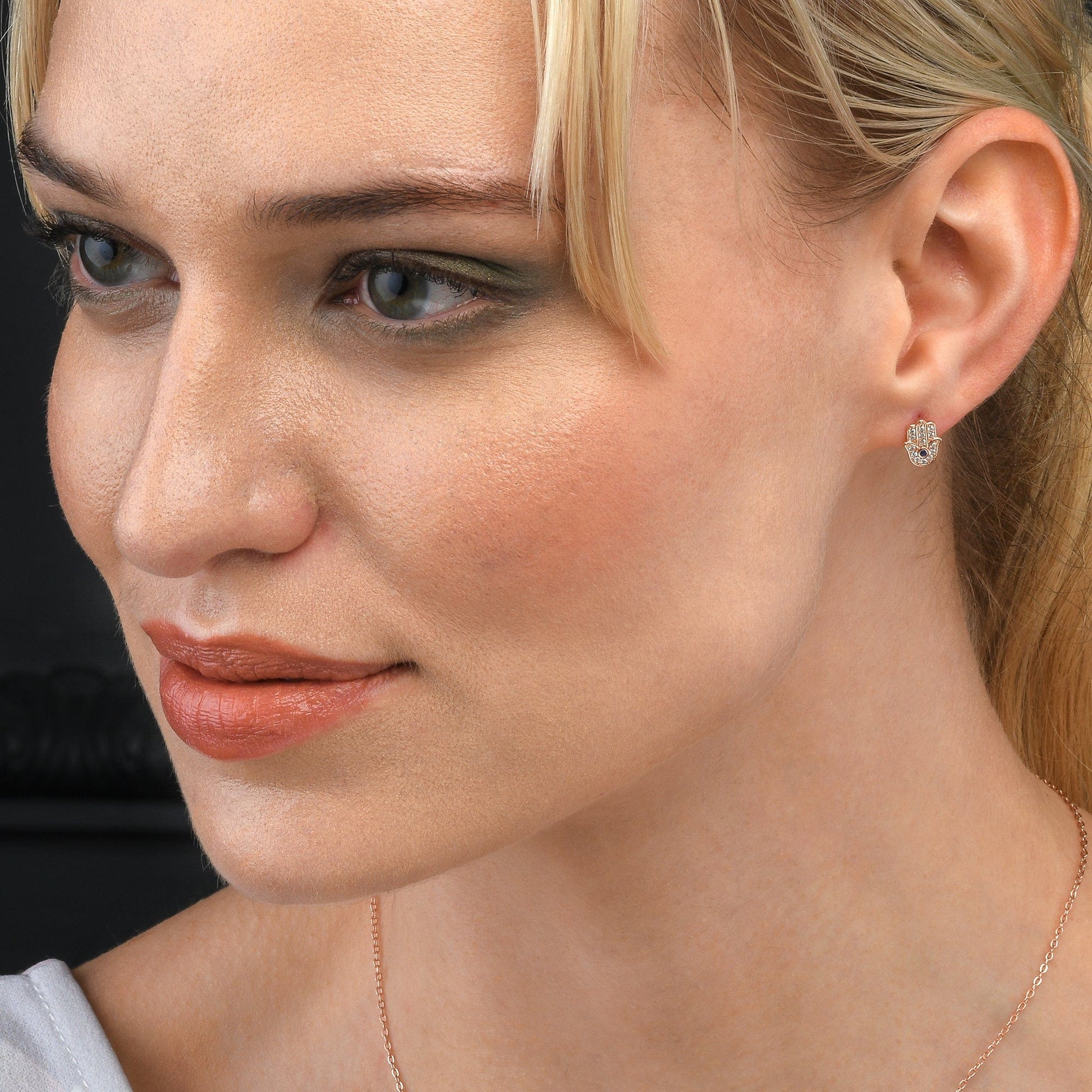 - Elegant hamza hand rose gold stud earrings for women with blue and clear AAA cubic zirconia stones