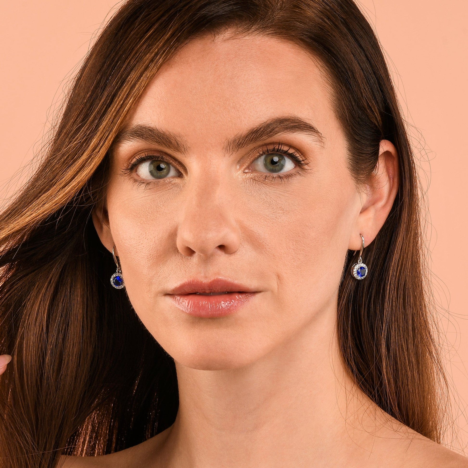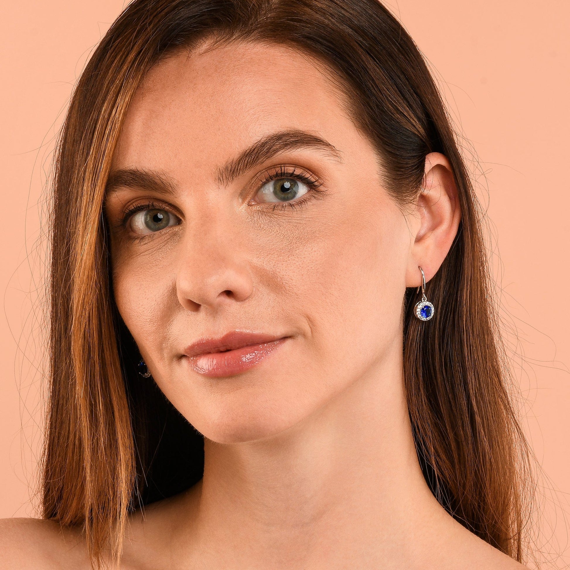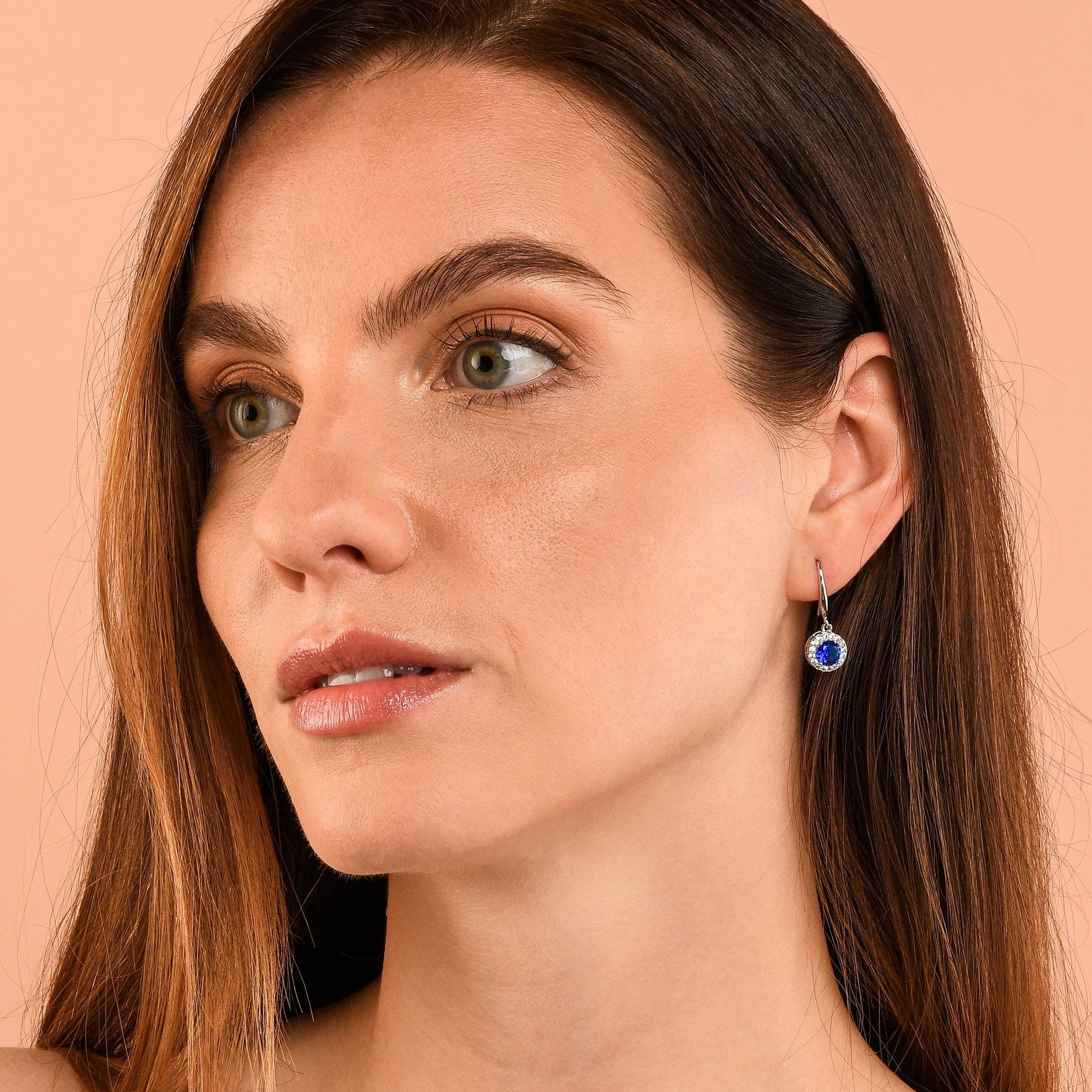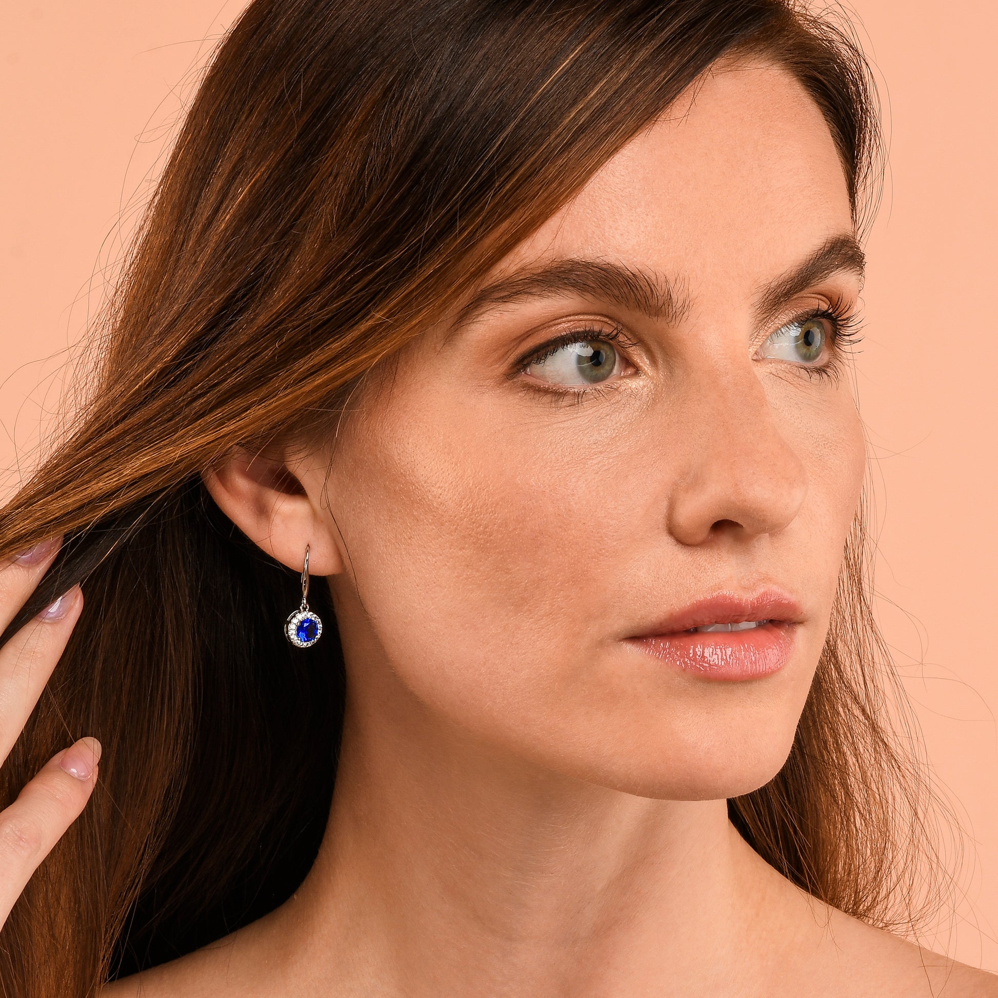 • Cute drop earrings for women with 9.5 mm x 9.5 mm round charm with 6 mm blue stones encircled by a halo of smaller stones.