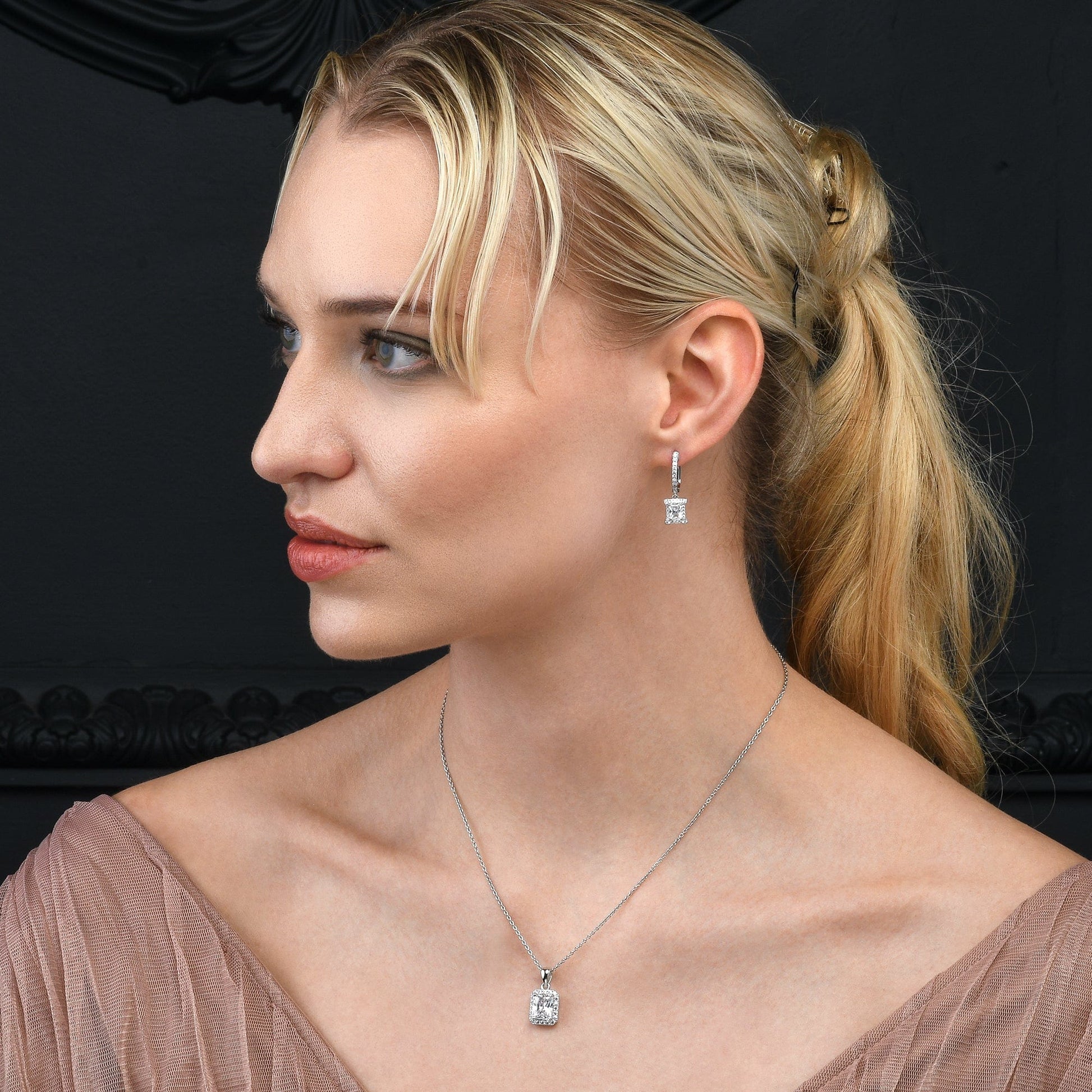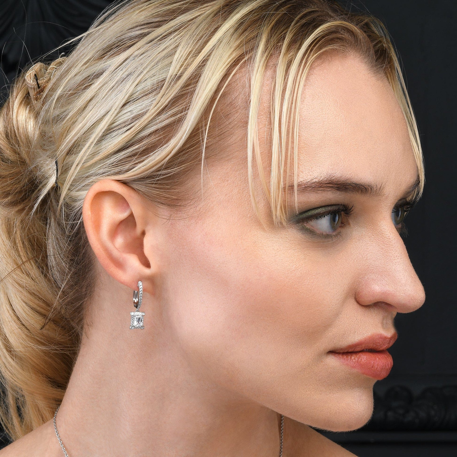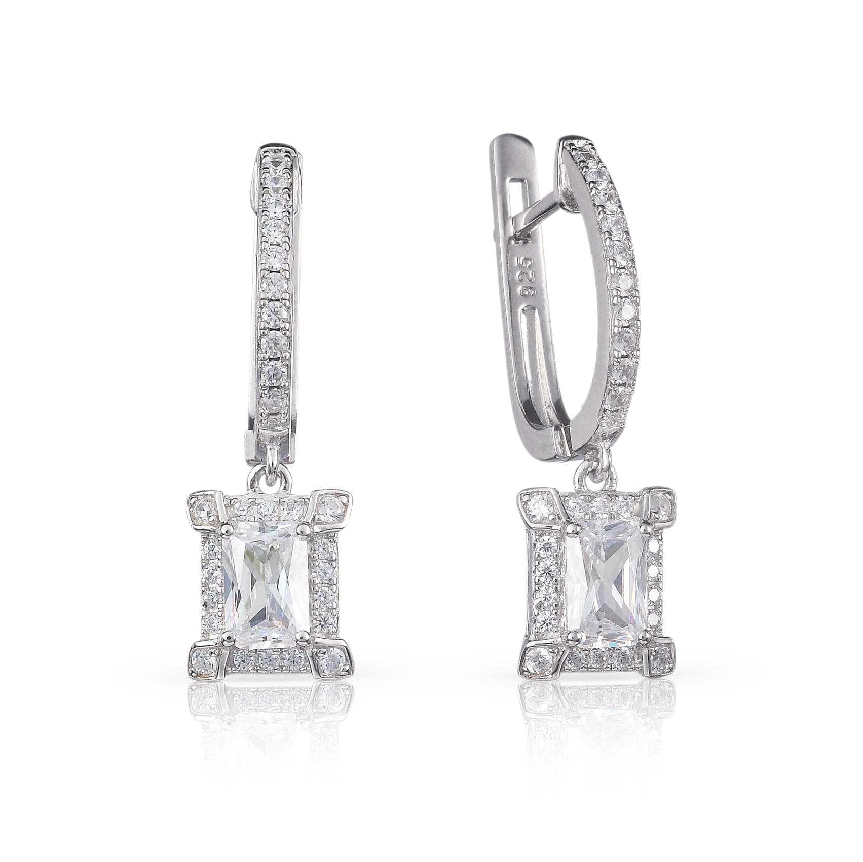 - Stylish 925 Sterling Silver earrings for women and teenage girls, with dangling rectangle-shaped charms set with sparkling cubic zirconia stones, with a hinged back clasp.