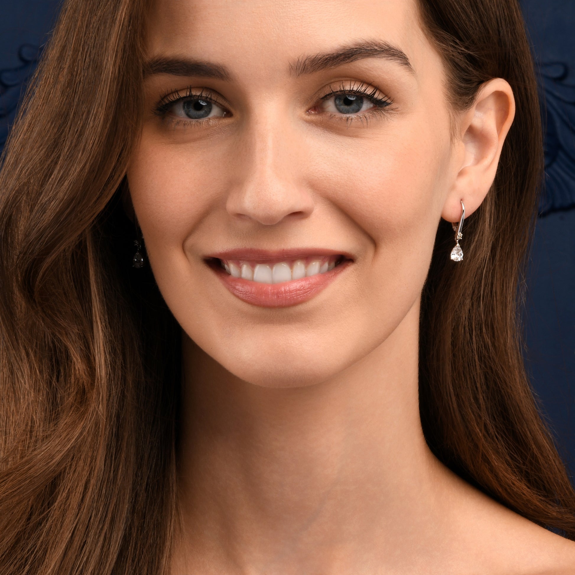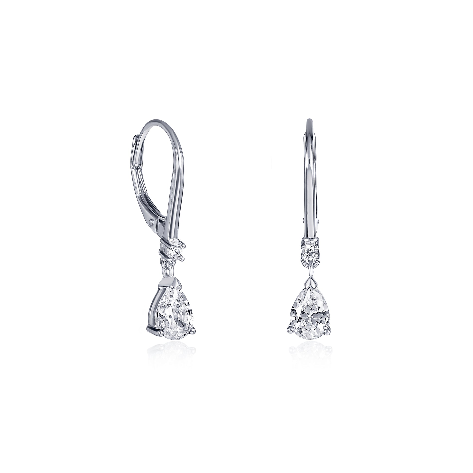 • Small drop earrings for women with 6 mm x 8 mm pear-shaped clear cubic zirconia stones and an accent with 2 mm round clear cubic zirconia. 925 Sterling silver dangle earrings for women with leverback clasps.